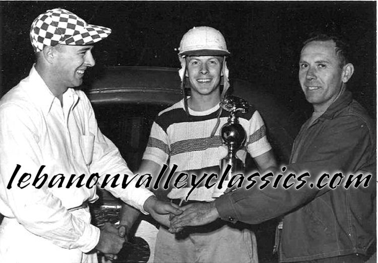 sheet cakes commemorating some special event in his life. That’s one lucky guy. Another Article featuring Doug Garrison. There were plenty written. In 1948, an eighteen year old left home to help "tweak" a buddy's race car at Altamont Speedway. When the driver didn't show, this boy was placed behind the wheel to pilot the car himself. A fine fifth place finish that day in a starting field of twenty racers sealed his future. Doug Garrison would be a race car driver. A mechanic at a local Chevrolet dealership and the physique of a star high school athlete, both attributed to his success. But it was his calm cool nature that took him to victory lane on more then one occasion. In 1950, he took over the seat of the Barney Thompkins owned number 99. This car took him to the track titles at both Rhinebeck and Empire speedways in 1951. Thompkins and Garrison liked to brag about the number 99. They had purchased it from Gordon Ross for just $800. The same day they took the car to Rhinebeck and won a cool $1,183, a profit of $300 in just one day. In 1952, Garrison took to the road, racing some eight times a week, and holding down his own job. He would run every night and twice on Sunday. These ventures would net him some three to four wins every week, on either asphalt or dirt. In 1956, he turned his attention to dirt track racing at Lebanon Valley and Onteora speedways. His traveling was decreased greatly, mainly held to the "capital district" tracks. In 1958, he was given the opportunity to pilot the Martin Riiska yellow number X. He took the car from last in the consolation to victory, tearing apart two gas tanks in the process. A few quick repairs and the X started from the rear again, claimed the victory in the feature. A partnership had emerged. The X was a tes. monster, perfect for Garrison's style of driving. They became almost an unbeatable combination. This teaming started Garrison on the way to 30 Lebanon Valley victories, including the 1963 Lebanon Valley sportsman championship. He was now almost totally dedicated to the Valley as his one' and-only speedway. This dedication led to him being called "Mr. Lebanon Valley". In 1964, Garrison moved on to the Gordon Ross team and car number 19. During this time he became friends with Valley Open winner, Frankie Schneider. Garrison respected Schneider for his ability to competitively race on a limited budget. Schneider even invited Garrison to run one of his number 2 cars at Nazareth's Mile and an eighth track. At that event Schneider elected to use used tires on both cars to save expenses. Schneider dropped from the lead with a flat tire, leaving Garrison with the lead. A few laps later Garrison also had to turn pit side with a flat right rear tire. Garrison purchased the Ross number 19, after numerous years of success as a team. Garrison was about to go it on his own in the now renumbered number 5. He won the opener at the Valley each ofth next two seasons with that car. He even took the victory in one of the Valley Opens, beating out Bill Wilson. In 1972, Garrison began to sense the changes about to take place in stock car racing. Just four years earlier the Valley had turned to big block modified power. Now the homemade tube chassis era was about to replace the faithful American made stock chassis. Garrison was asked to drive the powder blue coupe number 37, owned by Bob Helwig. Garrison took the ride with mixed success the next few years. In 1974, Helwig updated his ride to a four Koni Schwinning chassis. Still Garrison could not get the Helwig car to victory lane. A late season 1978 crash at the Valley 200 brought Garrison to realize the chemistry was gone. He would drive a few times for Helwig in 1979, finally to relinquish his seat to Dave Leckonby. He would still attend the races at Lebanon Valley in his retirement. He saw the changes he sensed to modified racing take place, and spoke about his concerns over the high speeds and inexperienced drivers. On April 12, 1985, the town of Green port declared the day Doug Garrison Day. Garrison was battling a long illness with cancer. Yet he spoke fondly of his racing friends and fellow competitors. On July 24, 1985, at age 55, he past away from his illness, leaving behind his family and wife Beverly. Eleventh Photo: (From Left to Right) Head Starter, Dick Young, Ted Ryan (holding son Patrick) ,Doug Garrison and Howie Westervelt.