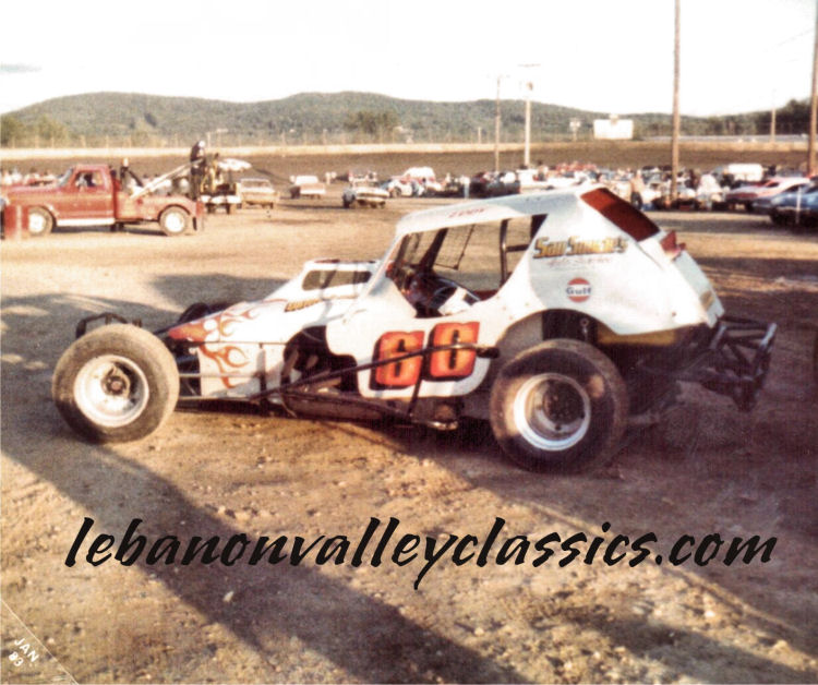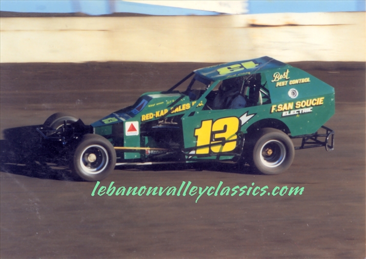 is that he won the very first official The 2nd thing Eddie San Soucie will be remembered for is the flip he executed when he was competing in the Modified division. At the start of a heat in 1984, Eddie caught a wheel and cart wheeled into the area separating the race track from the grandstands, finally coming to a rest vertically along the catch fence. Eddie was OK, the fans were saved, but the same couldn’t be said for Eddie’s machine. Second Photo: Eddie Piloting this #66 back when He was a Fonda regular.